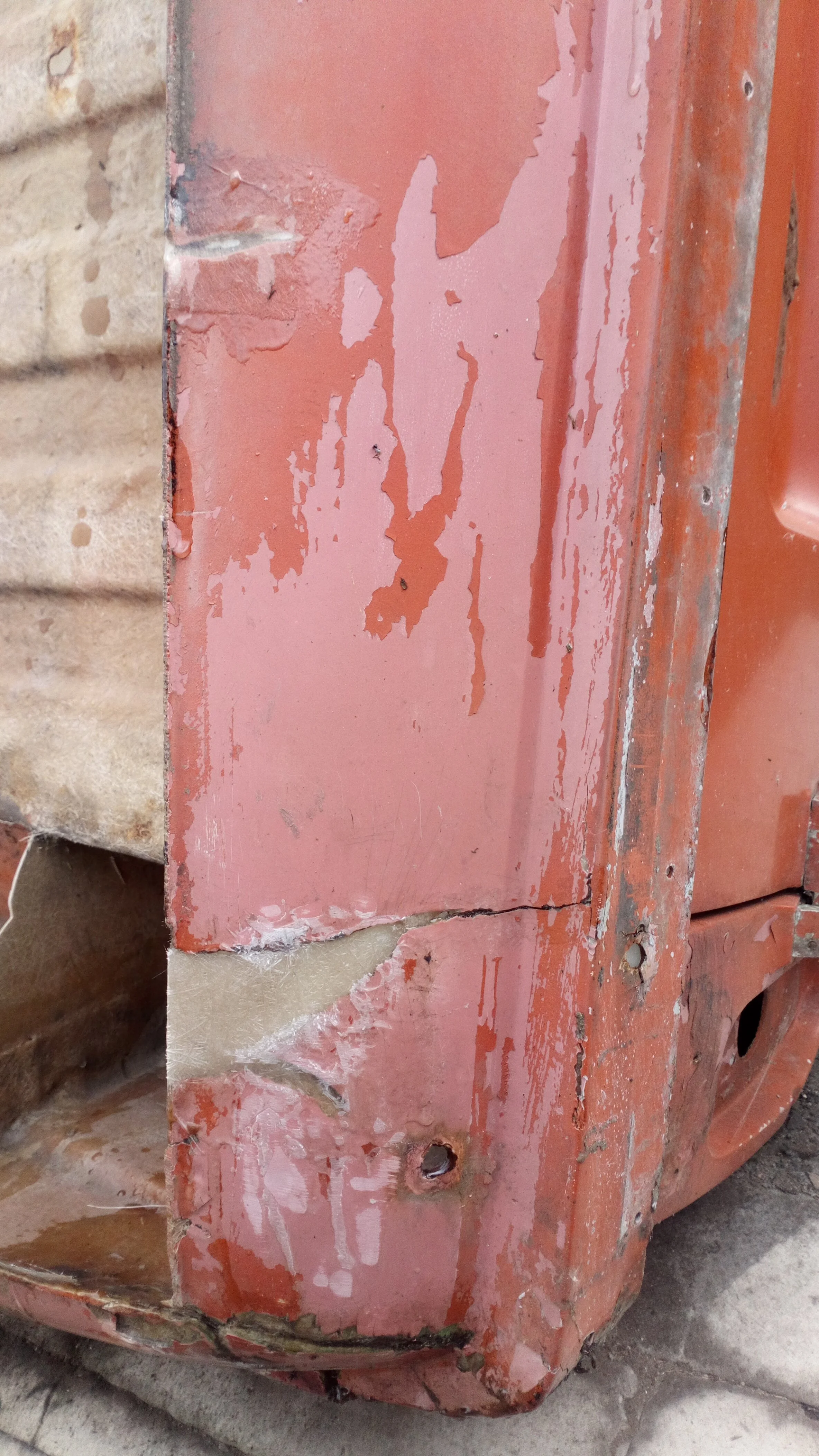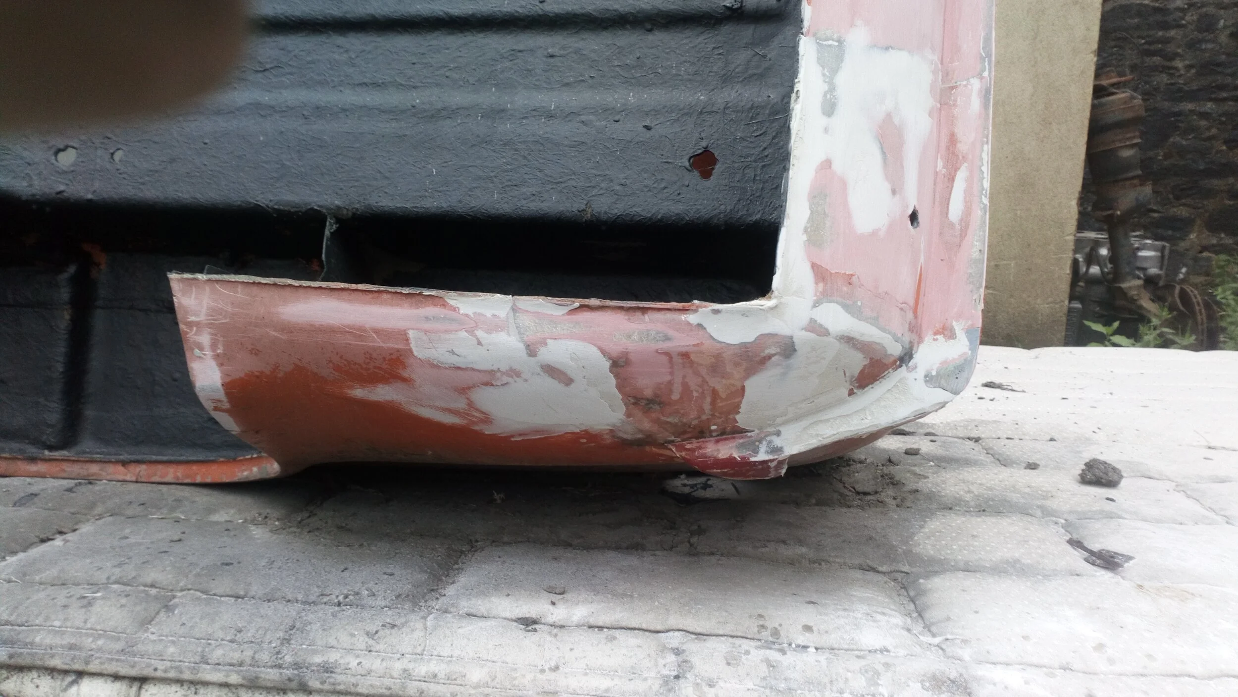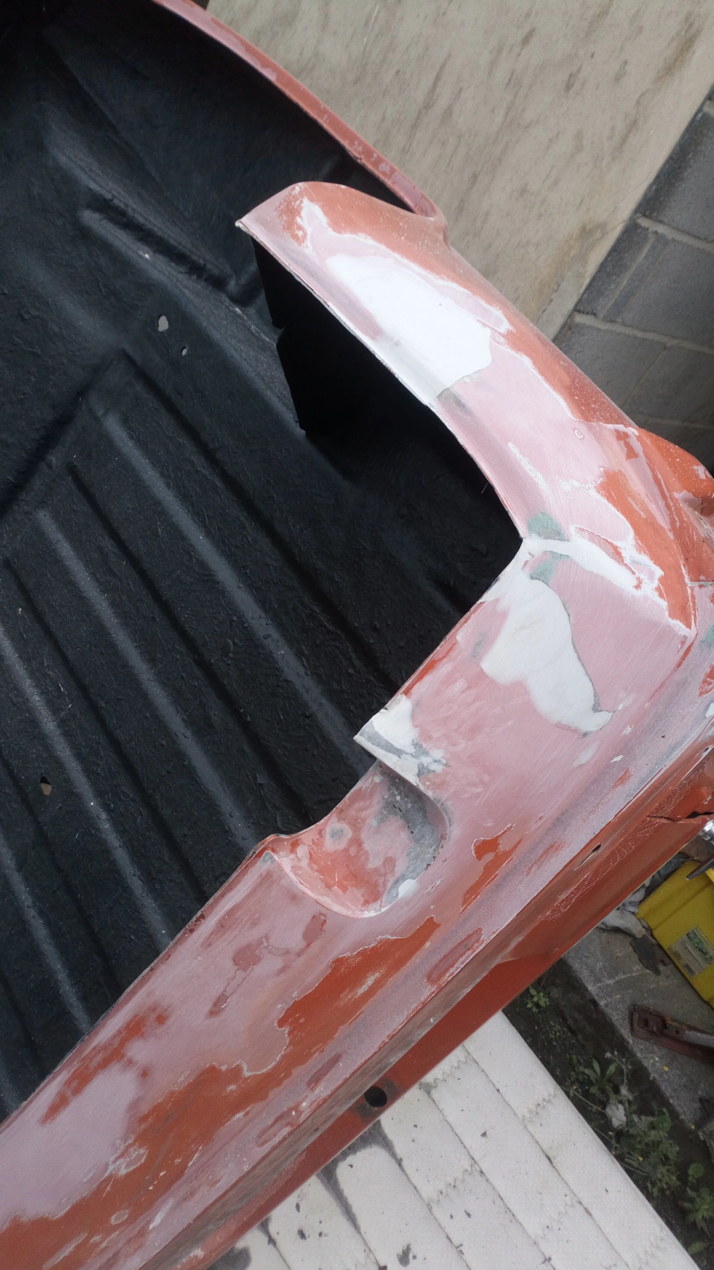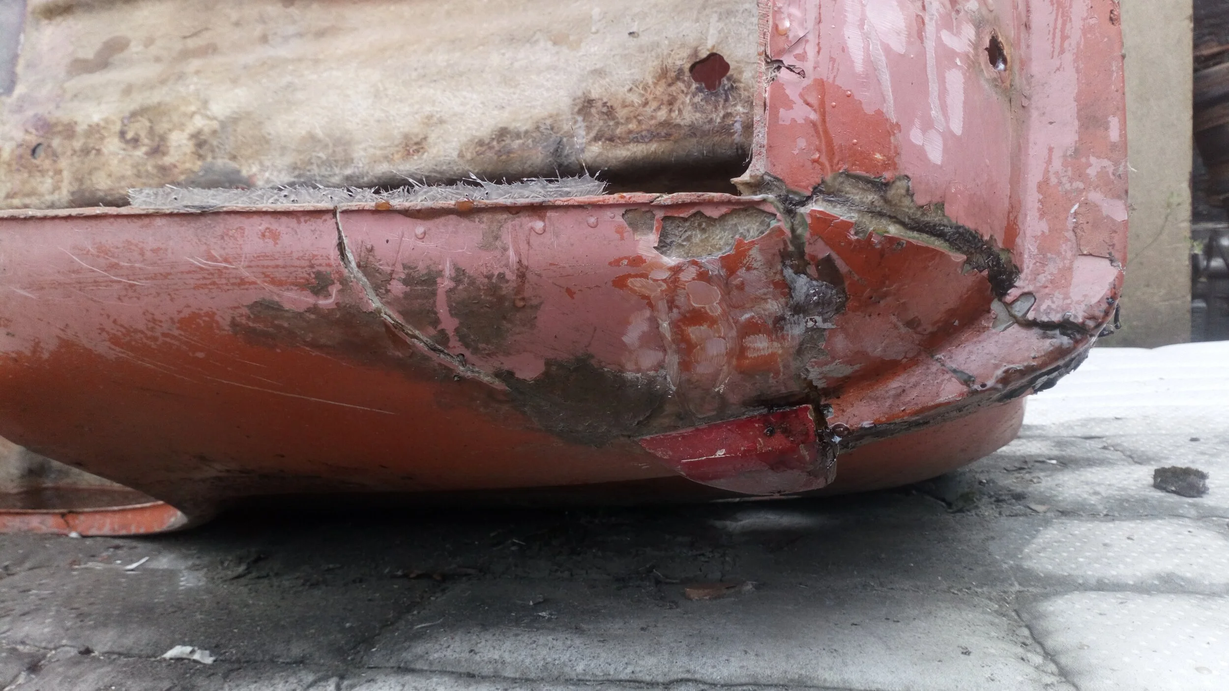 Off-side rear lower corner. Over the years this corner had clearly been broken and ‘fixed’ many times but without the advantage of the body being off the chassis and on it side. The old repairs were a mixture of resin and filler applied from the back/inside of the body over much of the dirt that had accumulated there. Those inadequate repairs were removed In pic 1. above, the hidden side has been cleaned and power-wire-brushed. Two layers of tissue and two layers of mat were layed up from behind; you can just see some of it protruding. With the area stabilised, the cracks were further ground back and fibre glass was layed up from the outside. In pic 2. above, a missing piece was layed up against a cardboard former treated with release agent. In pics 3. and 4. filler has been added to the outside of the repair and in pic 5. the area has been primed for protection and later fine-finishing.